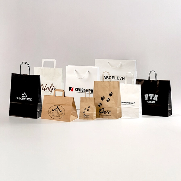 Valikoimastamme löydät useita eri paperipussimalleja, useissa eriväreissä ja eri kokoisina. Painatukset onnistuvat monivärisinä tai yksivärisinä, painatettavalle logolle tai kuvalle sopivaa painotekniikka hyödyntäen. Materiaalivalinoissa pyrimme aina suosimaan ympäristöystävällisiä materiaaleja, kuten FSC-sertifioitua paperia.
