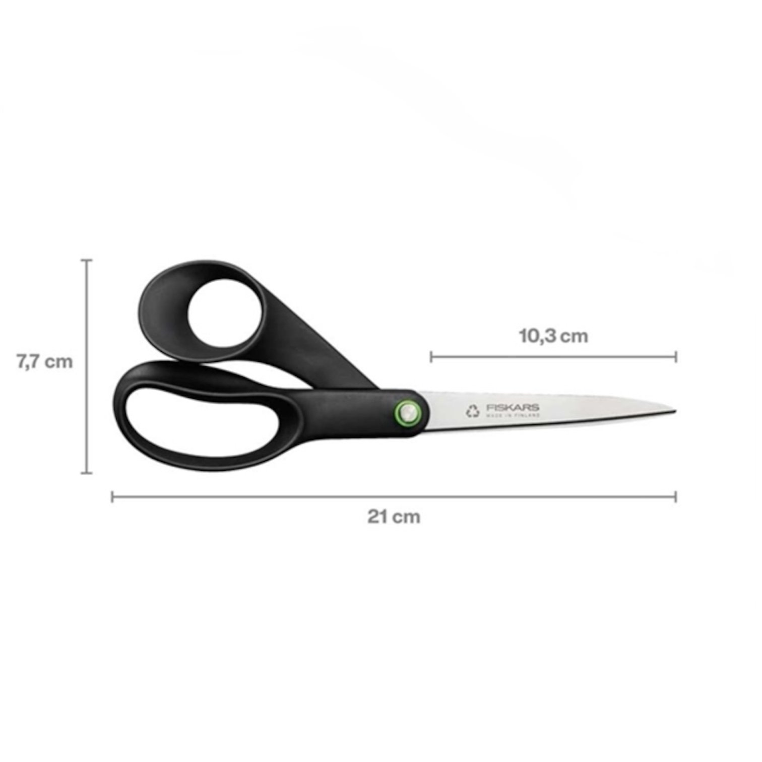 Ergonominen kädensija on valmistettu kierrätysmuovin ja lasikuidun yhdistelmästä, mikä tekee otteesta miellyttävän ja tukevan. Sakset on valmistettu Fiskarsin ympäristösertifioidulla Suomen tehtaalla, ja jokainen pari viimeistellään käsin parhaan laadun takaamiseksi.