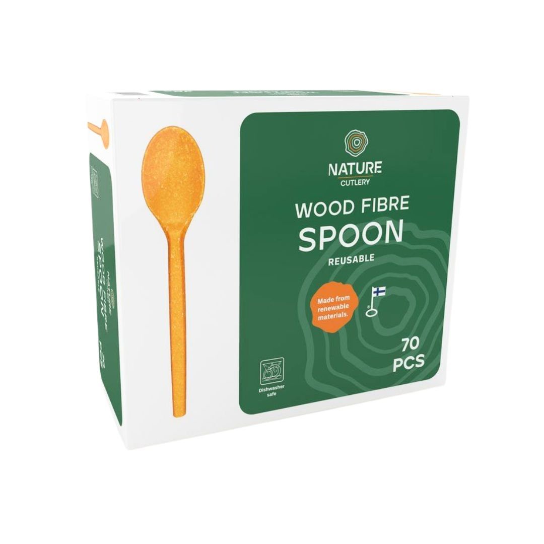 Puukuidusta valmistettu ruokalusikka (170mm) kotimaiselta Nature Linelta. Tuote on valmistettu 100% uusiutuvista luonnon raaka-aineista ja sen hiilijalanjälki on jopa 80 % pienempi, kuin öljypohjaisesta muovista valmistetuilla aterimilla. Puukuituaterimet voidaan kierrättää ja hävittää energiajätteenä.